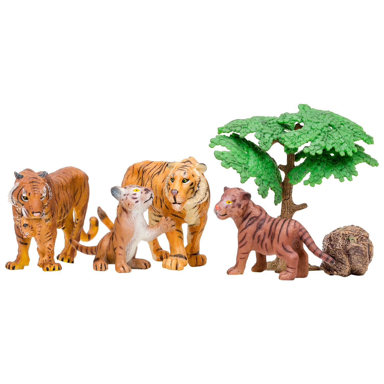 • В комплект входят: тигр (15х4х7 см), тигрица (15х4х7 см), 2 тигренка (7х2,5х5 см; 8х3,5х5,5 см), дерево (10х3х2 см), камень (4х4х2 см).