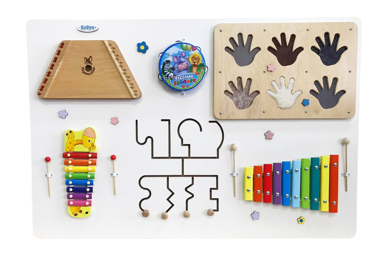 Основа бизиборда изготовлена из ламинированного МДФ, толщиной 10 мм, массива сосны и березовой фанеры сорт 1/2, 2/2.