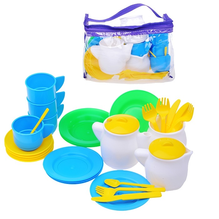В набор входит: кружки, блюдца, тарелки, вилки, ножи, ложки, сахарница, чайник, сливочник.