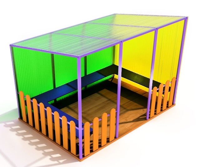 Очаровательная мини-веранда не займет много места на детской площадке. Вместе с тем компактные размеры - 2 х 2,5 м - не помешают ей укрыть малышей от дождя и ветра.